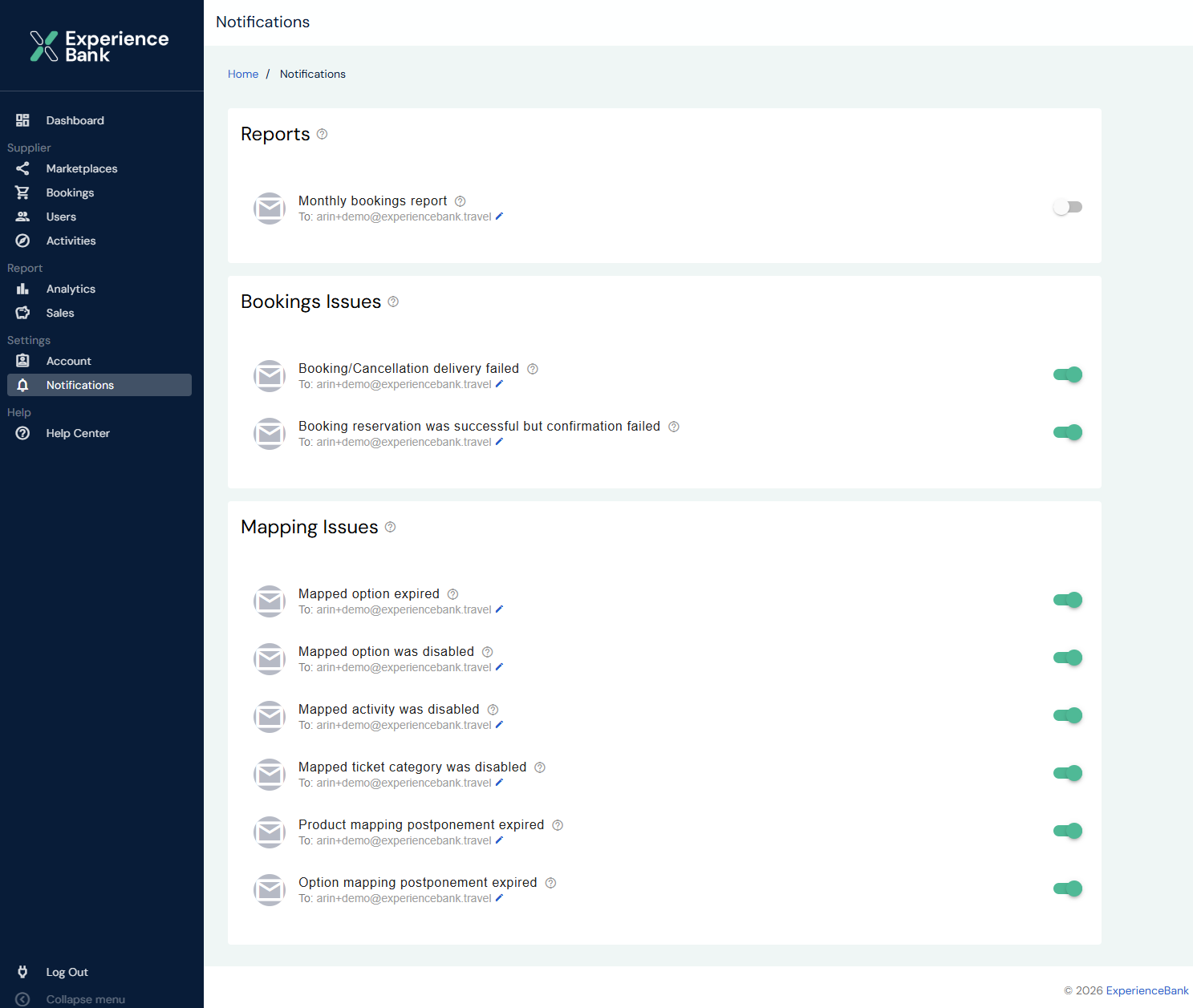 This article explains how suppliers can use the ExperienceBank Notification Center to stay informed about reports, booking issues, and mapping issues.